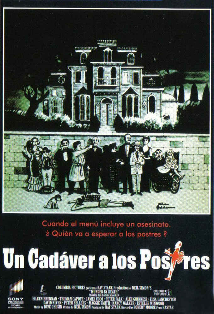 Otra de las peliculas mas divertidas de la historia ….»Murder by death» en su titulo original…con un reparto realmente acojonante…Peter Falk ( Colombo ) , Sir Alec Guinnes , David Niven , Nancy Walker , James Cromwell , Peters Sellers y el mismísimo Truman Capote !!! Un film mítico lleno de gadchets a cada minuto y en la que se parodia todas las películas de misterio , de asesinatos , de casas encantadas …como si fuera un cluedo cómico que hace una película realmente inolvidable…