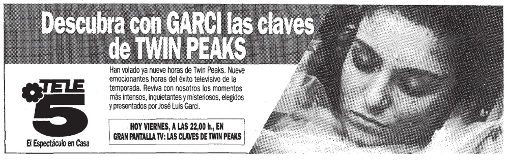 Justo el dia después , Viernes noche , Telecinco emitio un especial llamado «Las Claves de Twin Peaks» conducido por el oscarizado director Jose Luis Garci…en donde estuvieron analizando la serie , las claves de la misma , misterios y curiosidades.