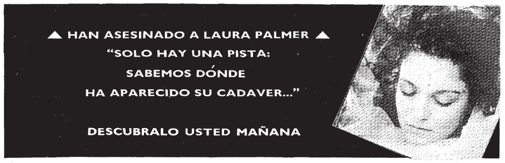 De repente una fría mañana de Noviembre del 10 de Noviembre vemos en la prensa una noticia que nos llama poderosamente la atención «Laura Palmer ha sido asesinada»….la noticia no decía nada mas….debido a que hasta esa fecha a lo que estábamos acostumbrados era a ver publi de «Soberano, es cosa de hombres» pues nos quedamos un poco patidifusos… A la mañana siguiente la misma noticia «Laura Palmer ha sido asesinada» pero con un poco mas de información «Nadie sabe quien la mato» y al siguiente dia de nuevo la misma información junto con esto « Solo hay una pista , sabemos donde ha aparecido su cadáver… descubralo usted mañana»